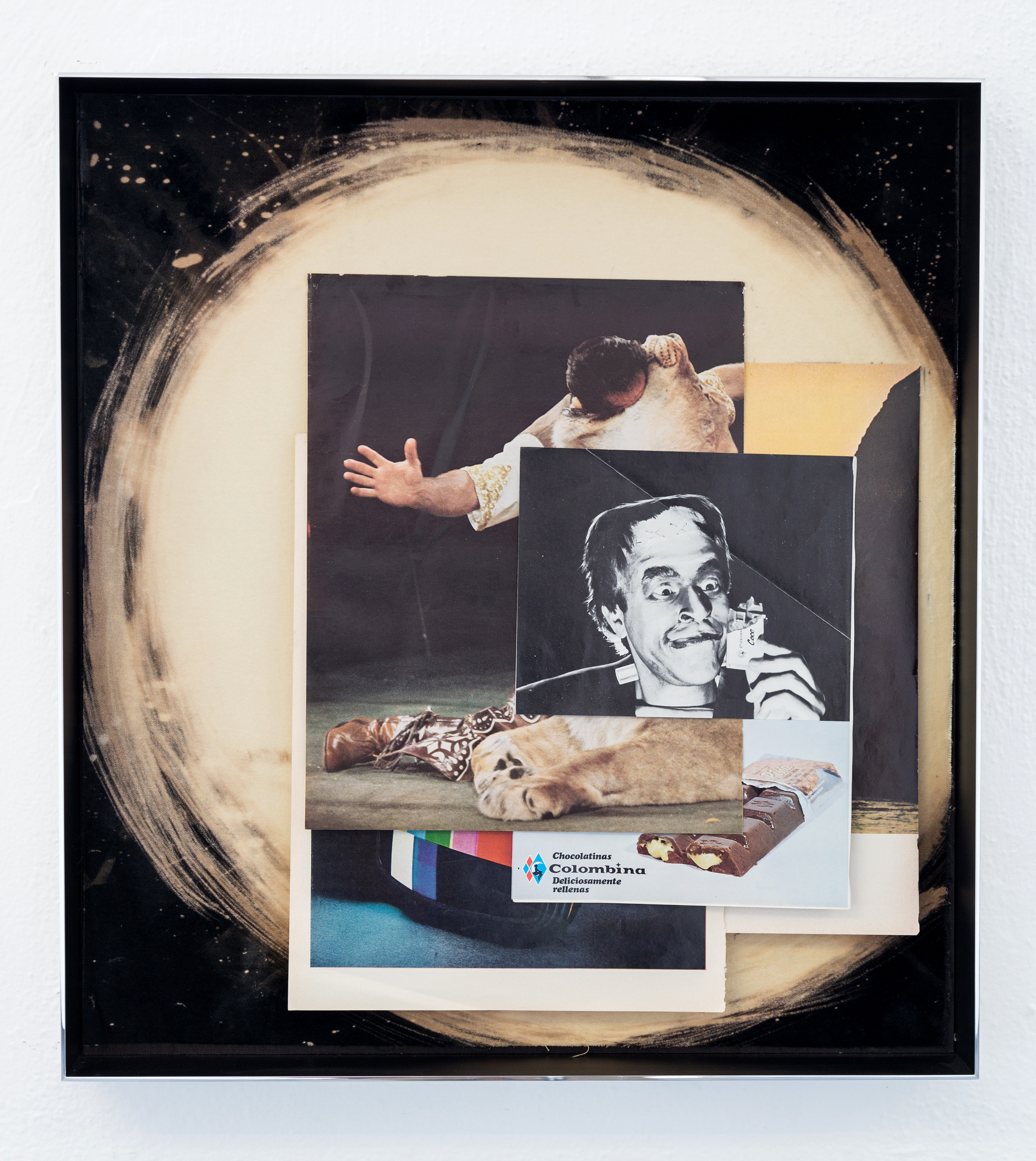 Untitled (devoured), 2019, magazine pages, bleached velvet, 58 x 53 cm